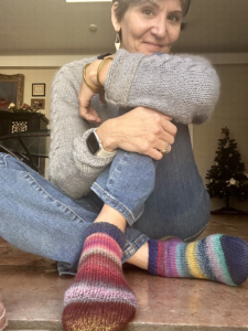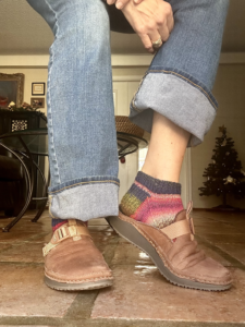 I recently found the Knitted Pom Pom Sock knitting pattern on CreativeBug.com and adjusted the stitches to fit my needles and yarn. For my project, I used three skeins of Schoppel-Wolle Edition 3, a fine Merino 100% virgin superwash wool from Germany. I purchased this yarn from Maker’s Mercantile in Kent, Washington, where the team was kind enough to allow me to browse and buy onsite. Although they no longer have a physical store, they have a showroom. Initially, I purchased their Shift Cowl Kit but decided to try making socks instead. I’m thrilled with the result! I paired them with my new Paonia clogs from Chacos, gifted by my oldest daughter, and I love the look and comfort.