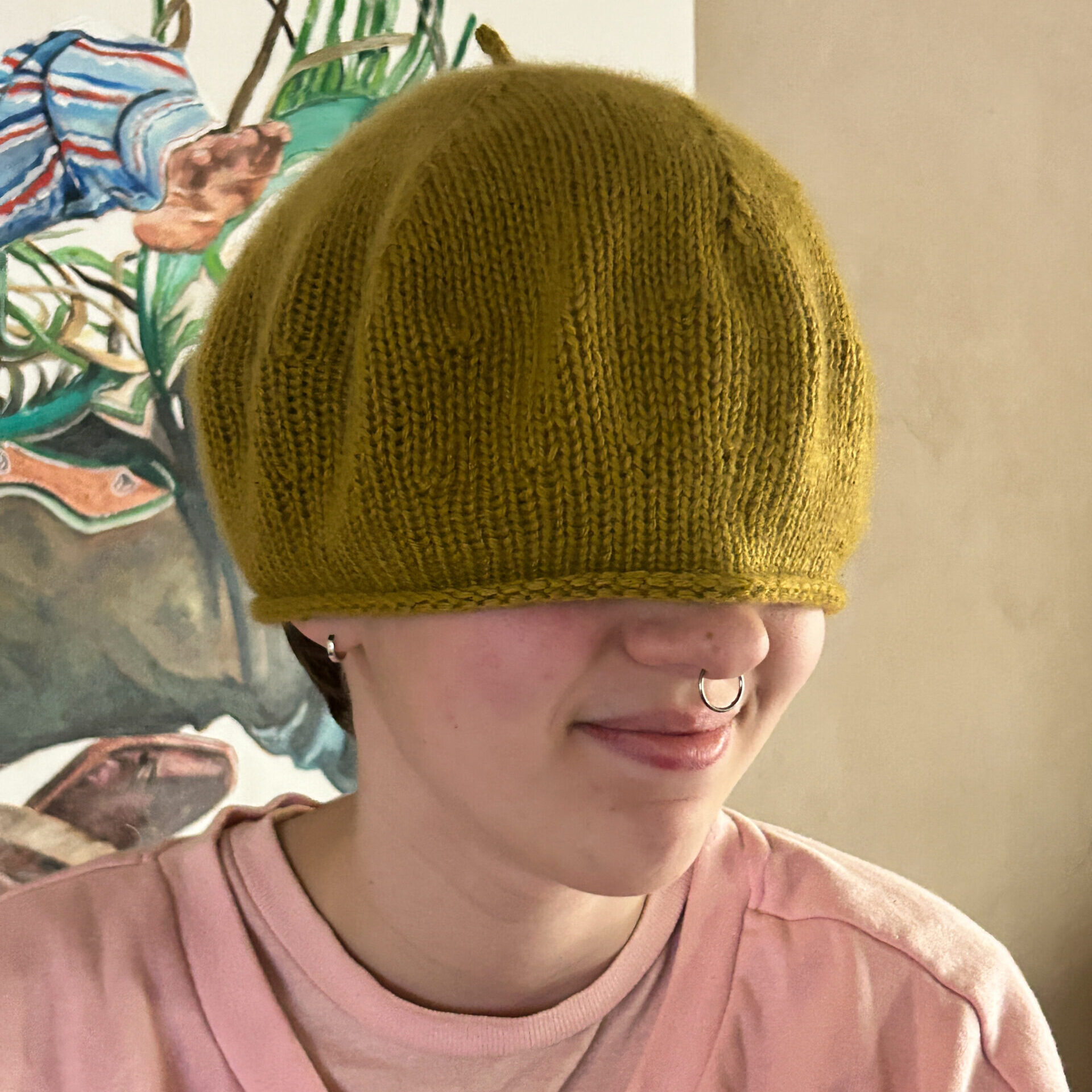 Despite using DK instead of worsted, the fit came out beautifully. I was slightly worried it might be too snug, but after blocking, it fit like a charm—and even looked great on my spouse (who has quite the noggin).
