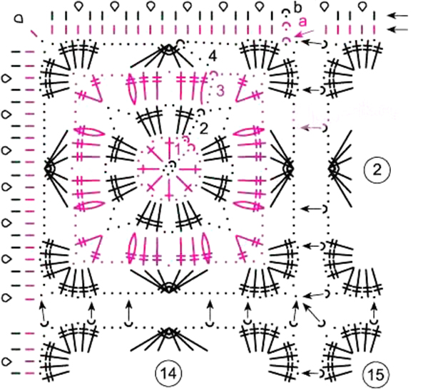 My notes: After you make the first motif, you start the second and begin to connect it in the fourth round of the motif, at 6 points along each side. The diagram from BeautifulCrochetStuff.com helped me to figure this out, as it isn’t written anywhere in the crochet pattern.